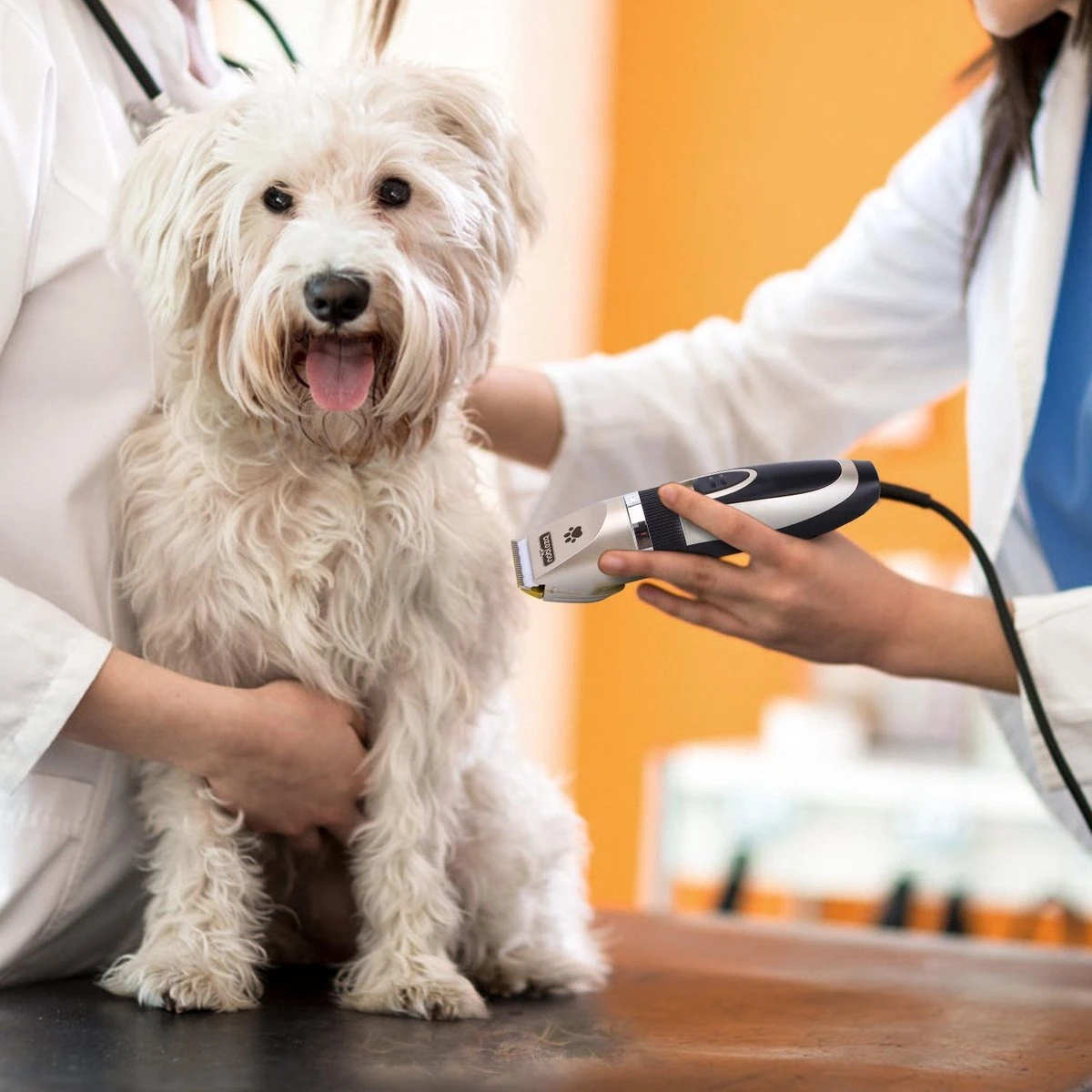 Professionele dieren trimset inclusief afstandhouders, vachtschaar en kam. Meer heb je niet nodig om de vacht van je hond of kat te trimmen. Een mooi afgewerkt draadloze uitvoering. Deze maakt weinig geluid waardoor je huisdier minder angst zal ervaren. De tondeuse is zonder opzetstuk in te stellen vanaf 0,8 t/m 2 mm. De vier opzetstukken variëren van 3 mm t/m 12 mm. Bij geheel lege accu is er slechts 2 uur nodig om de tondeuse 100% op te laden.