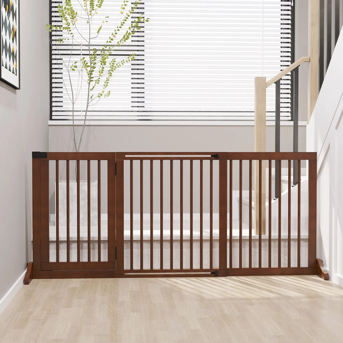 Onze poort is een veilige en efficiënte manier om je huisdieren te beschermen en tegelijkertijd een decoratief tintje aan je huis toe te voegen. Deze uitschuifbare poort heeft 3 aparte panelen. Eén vleugel doet ook dienst als deur waar je huisdier gemakkelijk in en uit kan stappen. Het hek wordt geleverd met een veiligheidsslot en steunvoeten om je huisdieren te beschermen. Een geweldig product voor het blokkeren van deuren, gangen en trappen!
