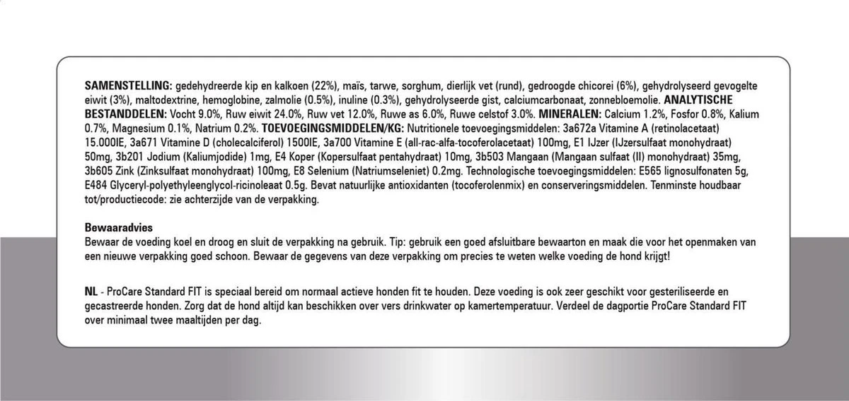 ProCare Standaard-Fit is een ideale voeding voor de volwassen hond met een gemiddeld energieverbruik. Dankzij een aangepast energiegehalte helpt deze voeding de hond in optimale conditie te blijven. Hoogwaardige ingrediënten als zalmolie en FOS (fructo-oligo-sacchariden) zorgen voor een gezonde voeding die bijdraagt aan een gezonde huid en vacht, een optimale vertering en een evenwichtige darmflora.