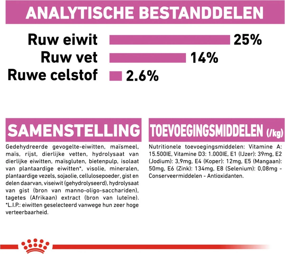 | Analytische bestandsdelen | ANALYTISCHE BESTANDDELEN: Ruw eiwit: 25,0% – Ruw vet: 14,0% – Ruwe as: 6,3% – Ruwe celstof: 2,6%. |