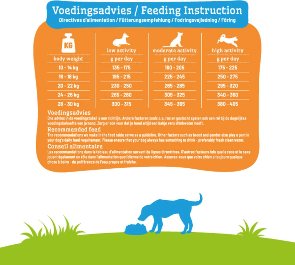 Ons advies in de voedingstabel is een richtlijn. Andere factoren zoals o.a. ras en geslacht spelen ook een rol bij de dagelijkse voedingsbehoefte van je hond. Zorg er ook voor dat je hond altijd een bakje vers drinkwater heeft.