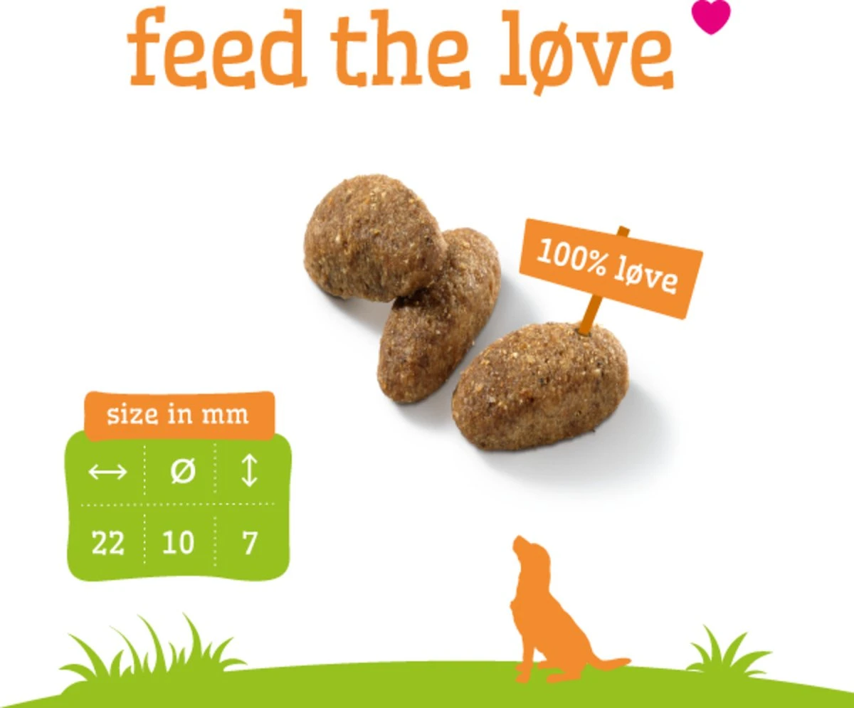 | Voedingswaarde | Kippenmeel (19%), mais, gerst, rijst, sorghum, kippenvet (gestabiliseerd met natuurlijke tocoferolen), lamsmeel (4%), bietenpulp, gehydroliseerd eiwit, MSC-gecertificeerde vismeel (2%)*, vitaminen en mineralen mix, cellulose (1%), gist, MSC-gecertificeerde visolie (0,8%)*, cichorei (0,7%), natriumhexametafosfaat (0,1%). *Uit een MSC gecertificeerde duurzame visserij |