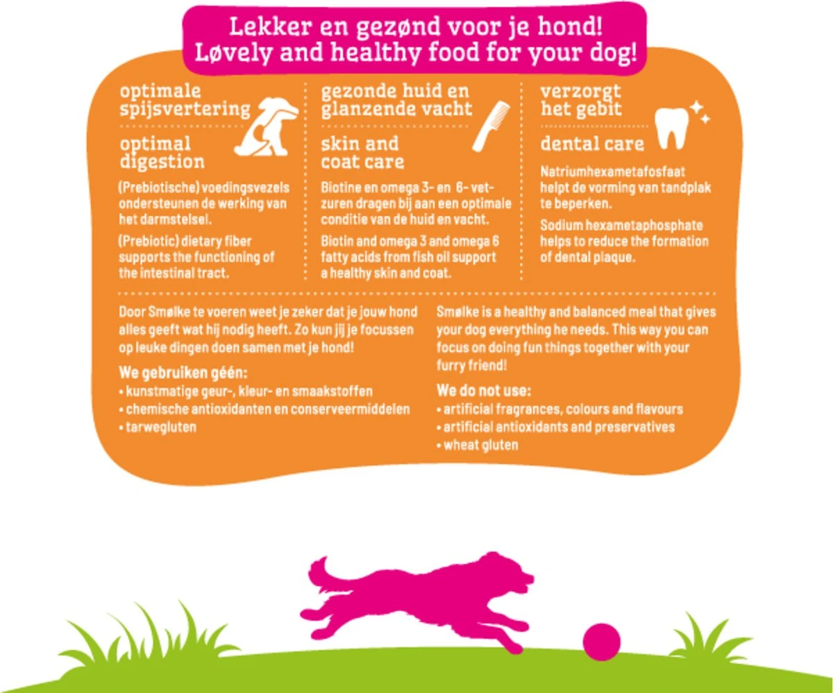Smolke Adult Medium Brokken 3 kgSmølke Adult Medium is een complete Alles-in-één hondenvoeding afgestemd op de behoefte van middelgrote volwassen honden vanaf ongeveer twaalf maanden en een gewicht tussen de 10- en 30kg. De voeding is samengesteld zonder tarwegluten en bevat speciale mineralen om tandplak te helpen voorkomen. Smølke Adult Medium is gemaakt met natuurlijke ingrediënten en heeft een uniek eiwitprofiel bereid met Nederlandse kip, MSC vis en Brits lam. Smølke Adult Medium is een gezonde en gebalanceerde voeding die iedere dag weer zorgt voor een blije en tevreden hond. Natuurlijk zonder kunstmatige geur-, kleur- en smaakstoffen en chemische antioxidanten.