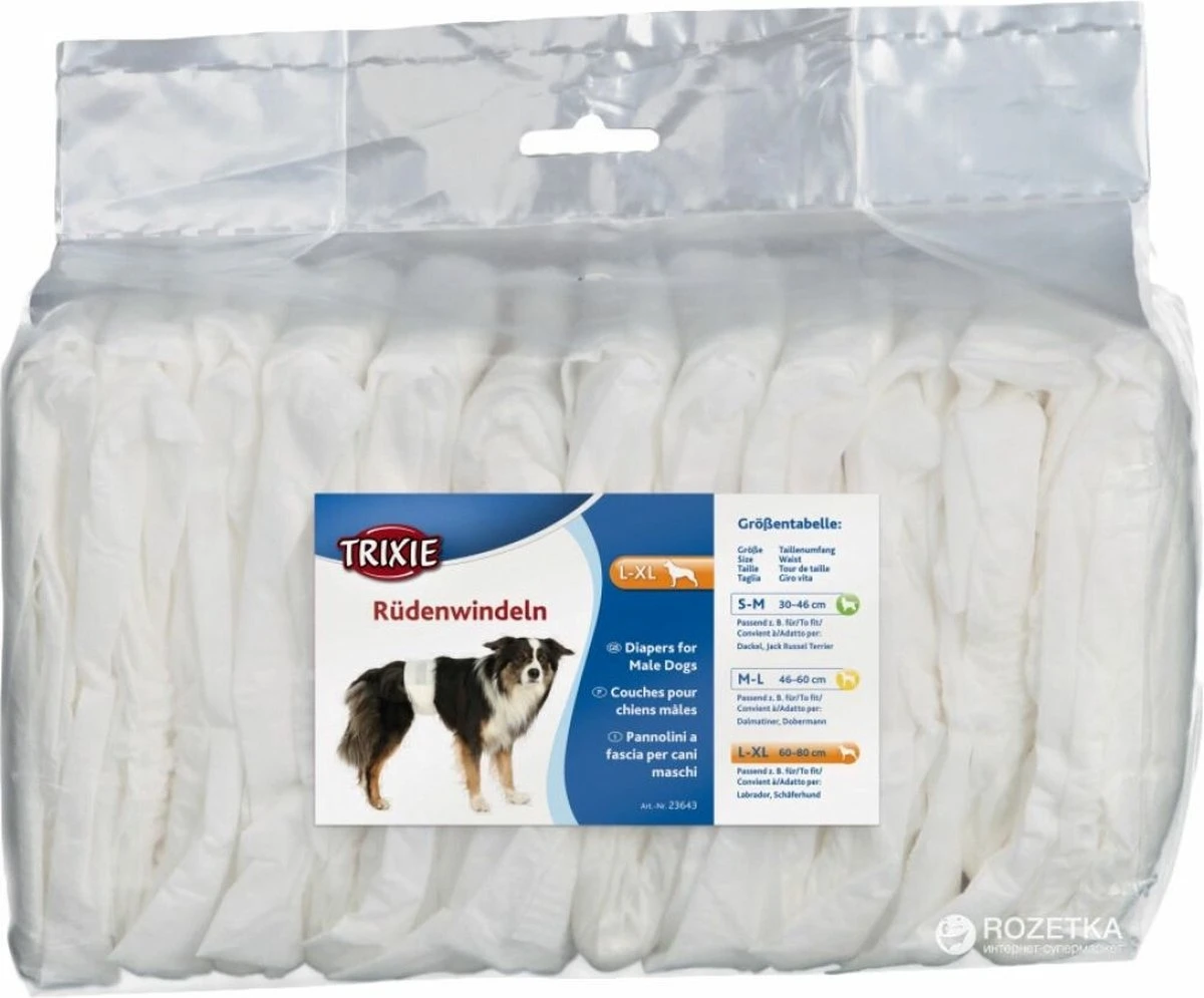 Deze Trixie Hondeluier Reu in de maat L/XL 12 stuks is een wegwerpluier speciaal gemaakt voor mannelijke honden die incontitent zijn door operaties, ouderdom of onderweg.